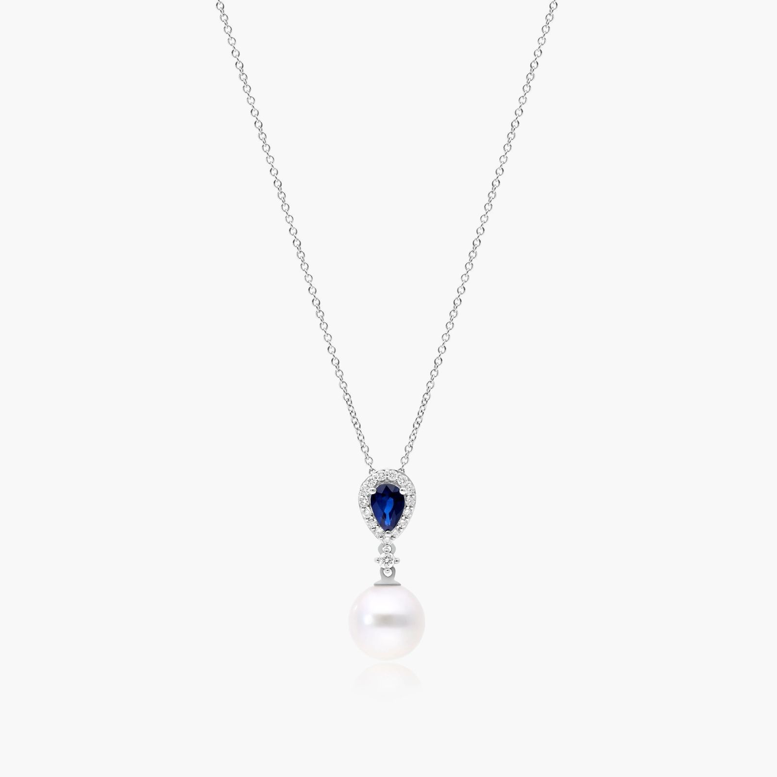 Feel glamorous with this stunning 14K white gold drop pendant displaying a deep blue pear shape sapphire with a diamond halo and an Akoya pearl for a soft and elegant look.