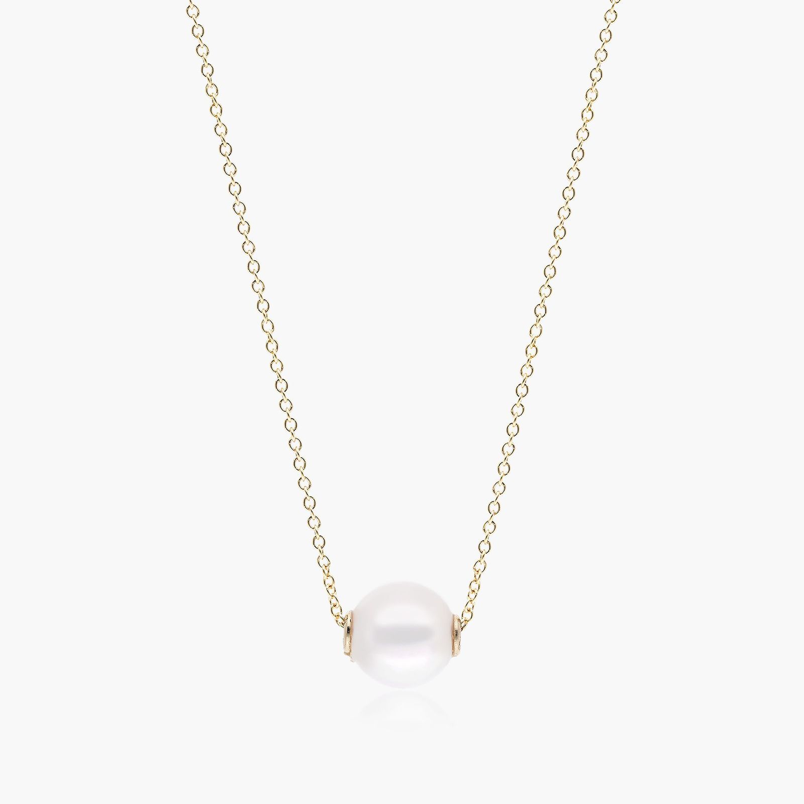 A solitaire akoya cultured 8mm pearl slides though a cable chain in this gorgeous, simple design. This delicate look is a staple for any jewelry collection.