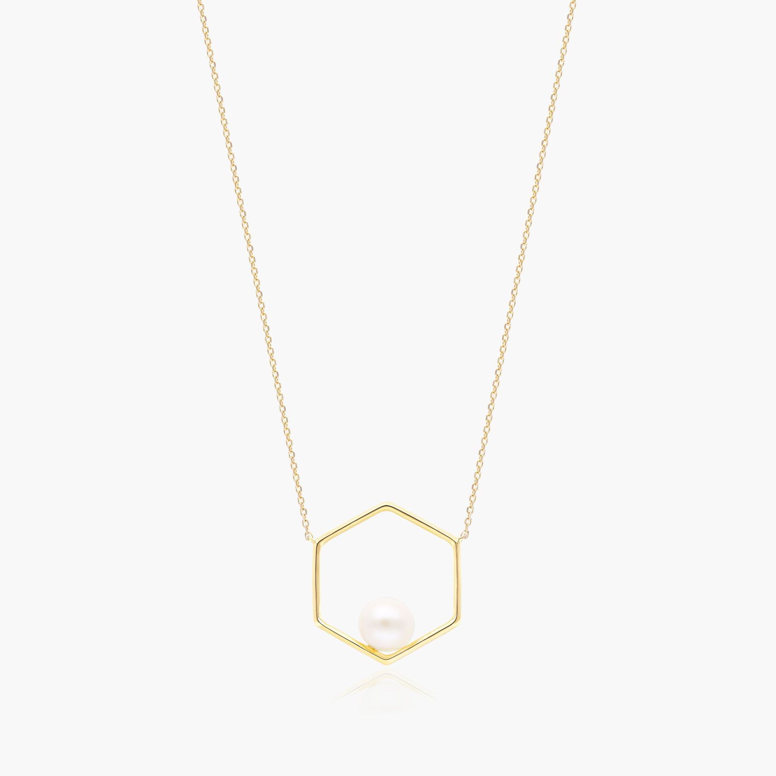 Minimalistic yet striking. This pendant plays with the clean geometrical lines of the hexagon, the negative space and the roundness and softness of a 7mm freshwater cultured pearl.