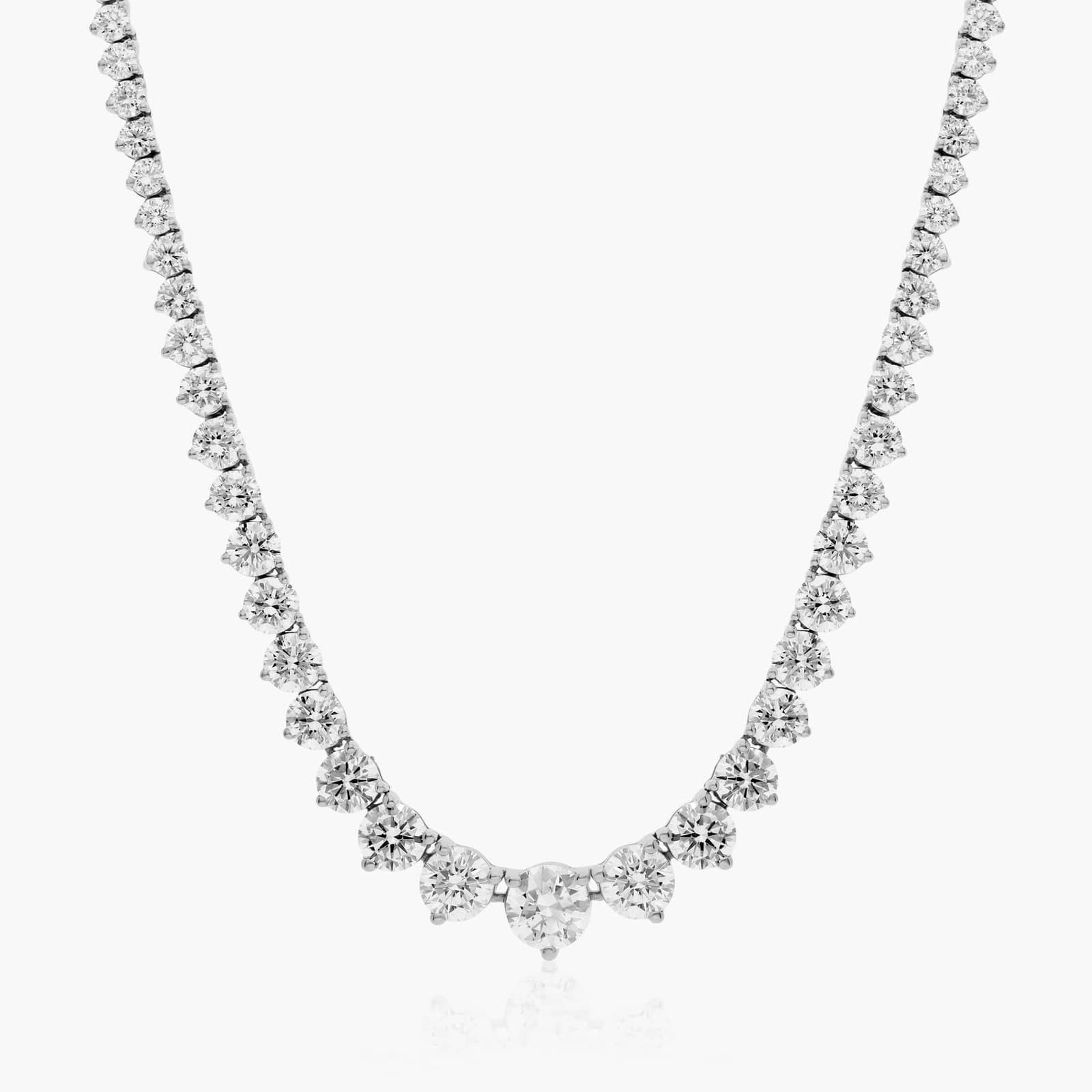 A dazzling array of round brilliant diamonds gracefully graduate towards the center. This luxurious and elegant tennis necklace features three prong settings and a box catch with hidden safety.