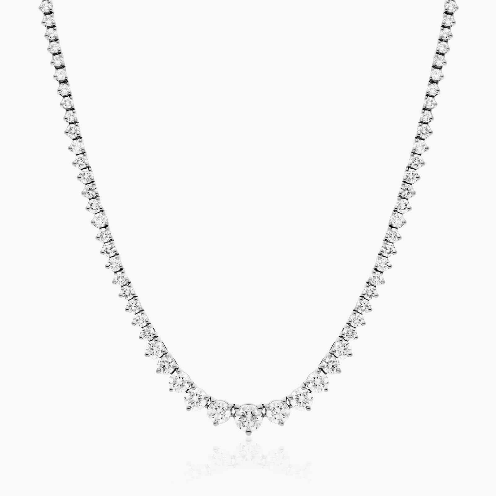 A dazzling array of round brilliant diamonds gracefully graduate towards the center. This luxurious and elegant tennis necklace features three prong settings and a box catch with hidden safety.