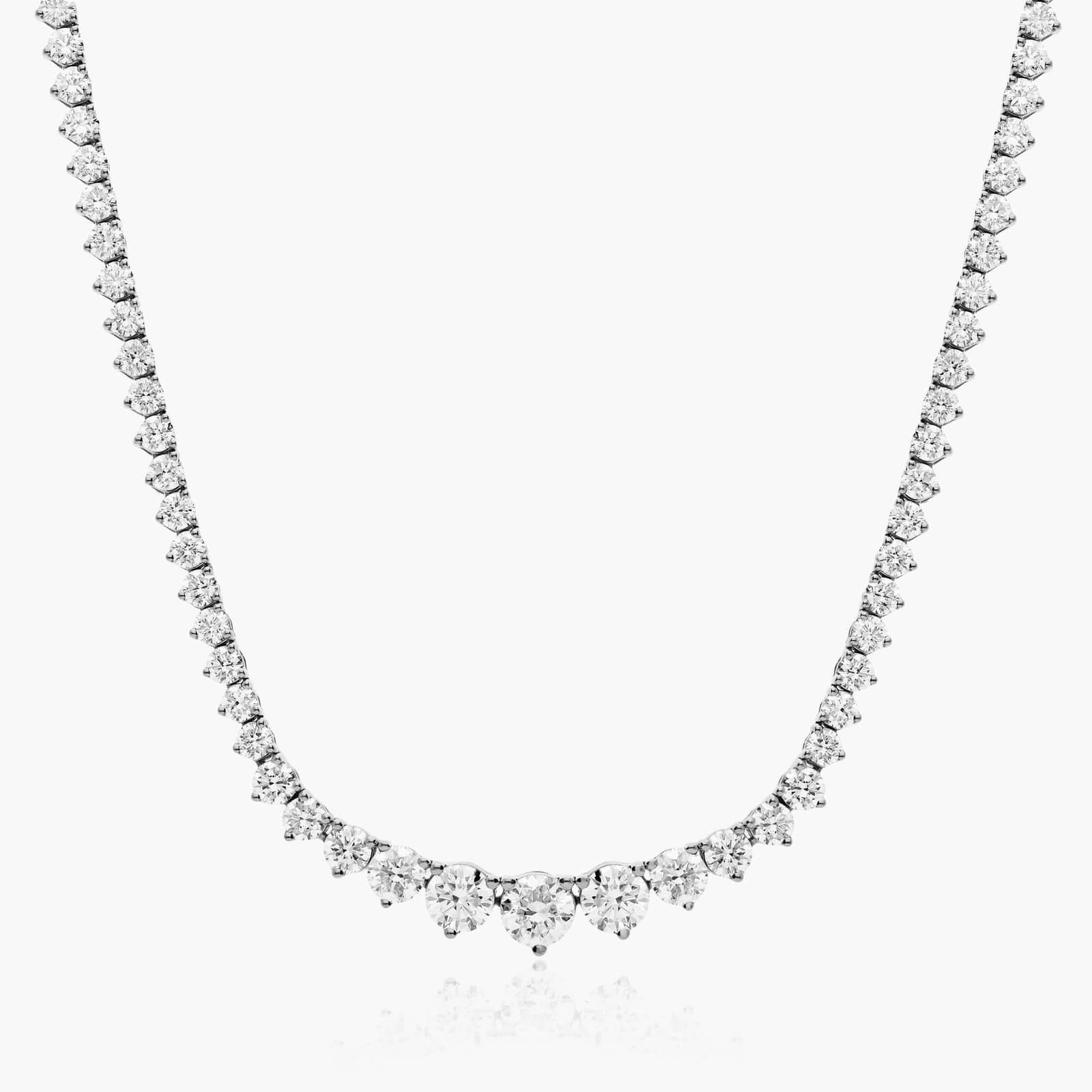 A dazzling array of round brilliant diamonds gracefully graduate towards the center. This luxurious and elegant tennis necklace features three prong settings and a box catch with hidden safety.