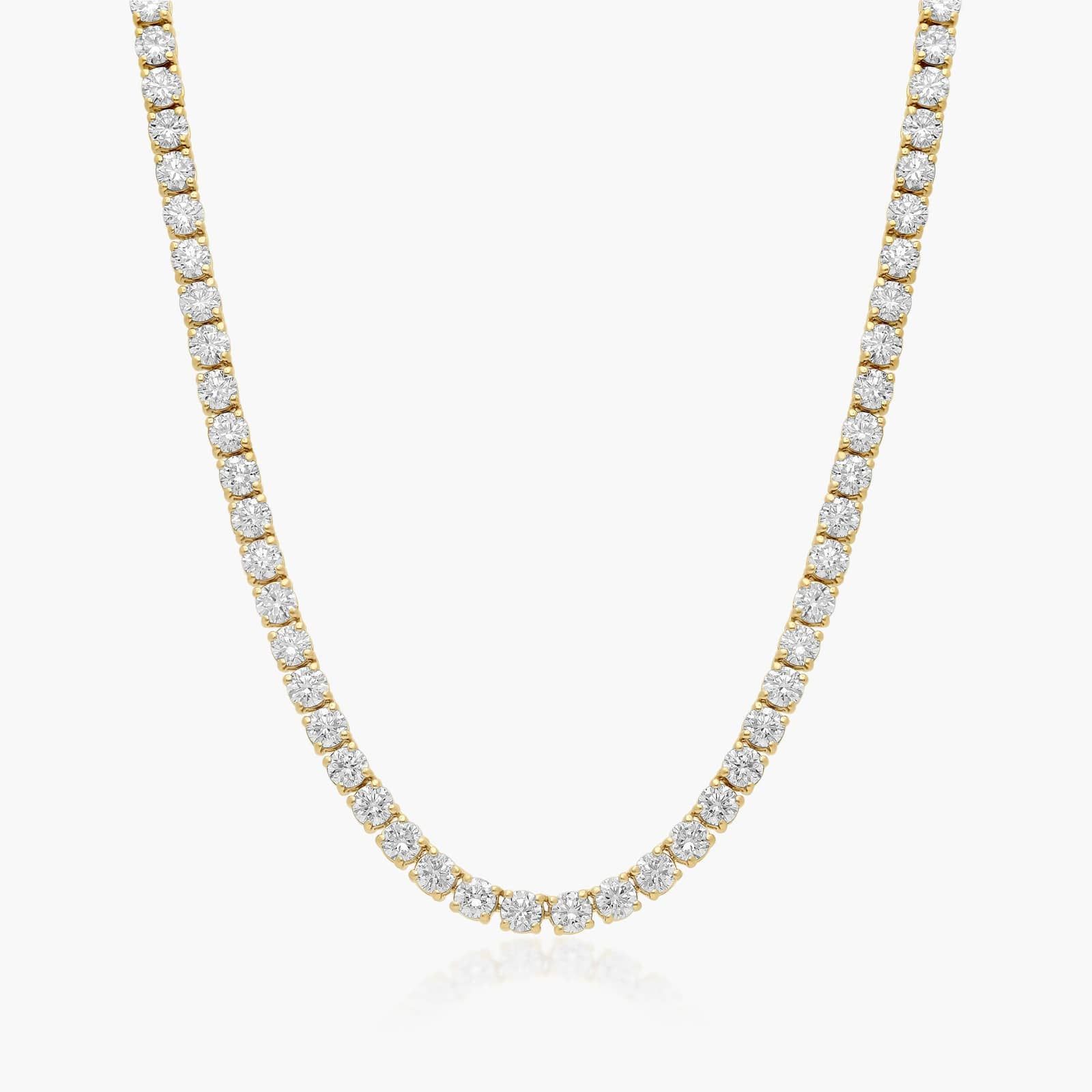 This tennis necklace is the epitome of elegance. A row of scintillating Lab-Grown round brilliant diamonds are set on four prong baskets and lined up perfectly to create the most glamorous diamond necklace. A box clasp with security latch closes and secure the necklace in place.
