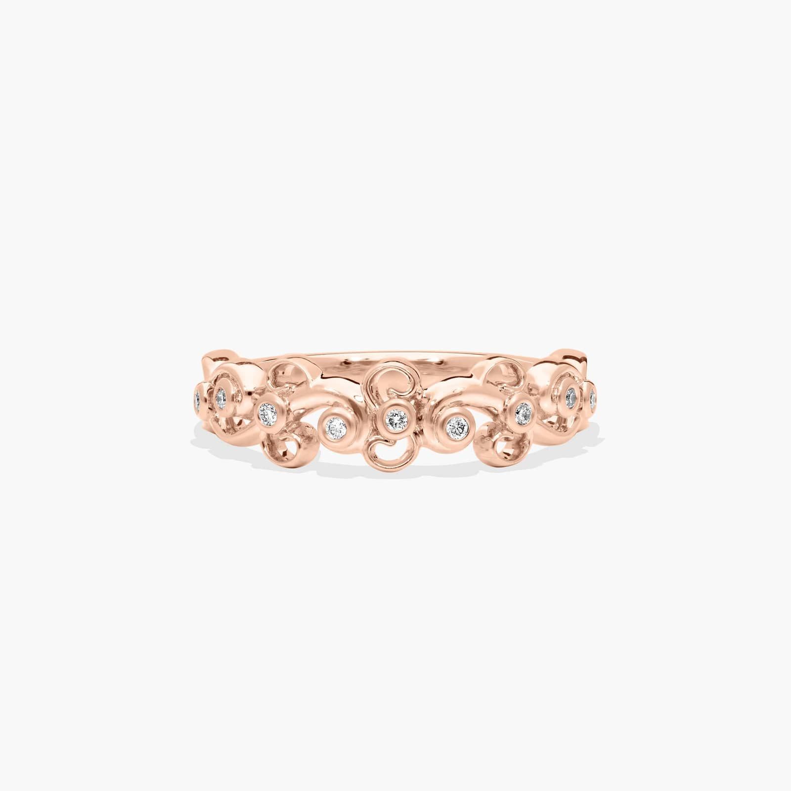 Scrolling ribbons twist and turn around bezel set diamond blossoms to create this fetching diamond wedding ring.