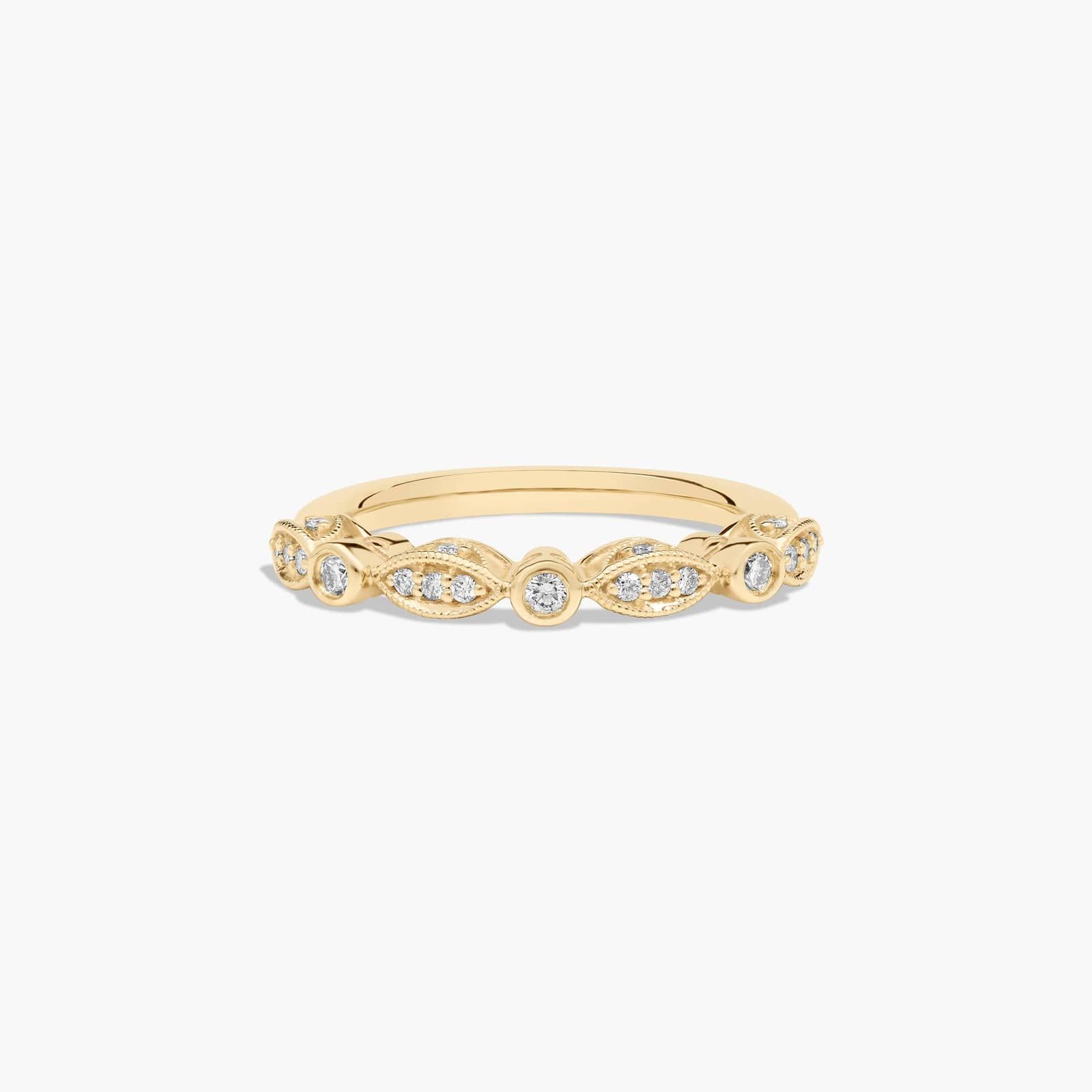 This captivating bezel and pavé set diamond wedding ring features milgrain beading and engraving, making it an eye-catching piece from all angles. This is a guaranteed attention-getter! It is made to match engagement ring 11105.