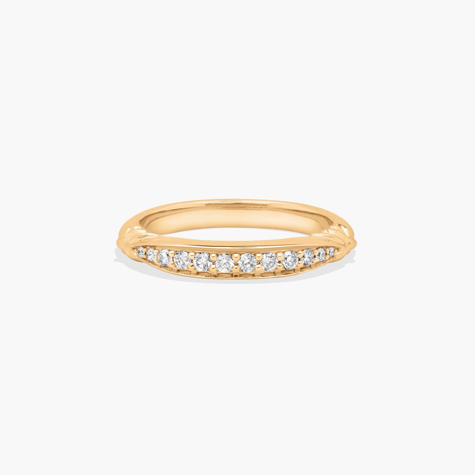 A nest of graduated pavé diamonds are delicately balanced amid sculpted flower side accents.