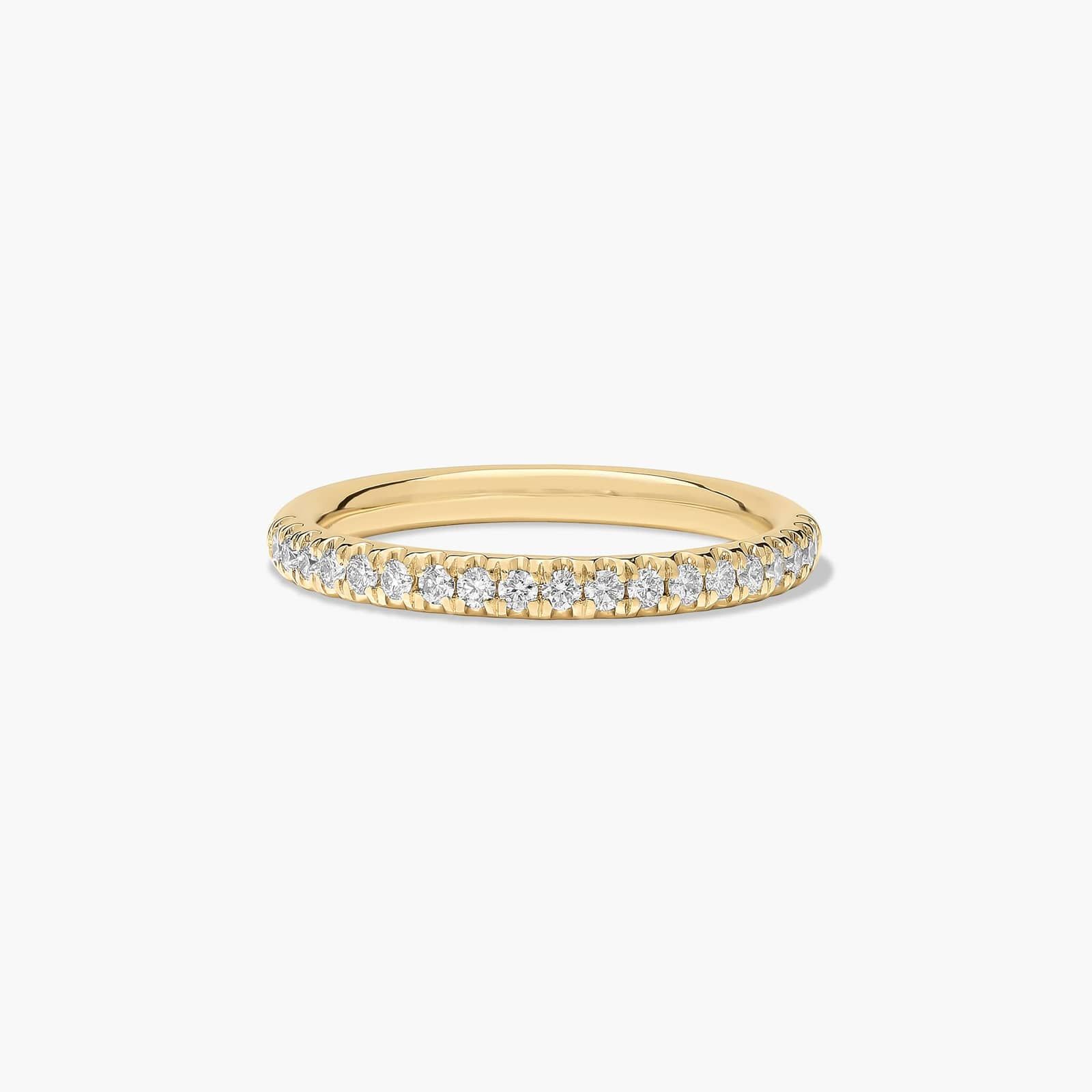 Round brilliant diamond are carefully placed to complement the organic design of your engagement ring. This wedding band curves in the center for a perfect match.