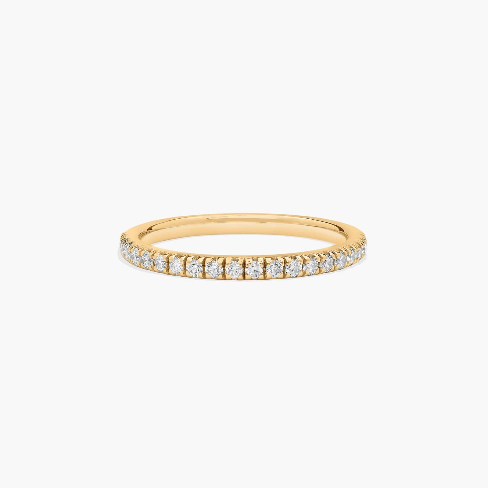 This eye catching diamond ring features a row of round brilliant diamonds that match perfectly with our Cathedral pavé Crown Diamond Engagement Ring.