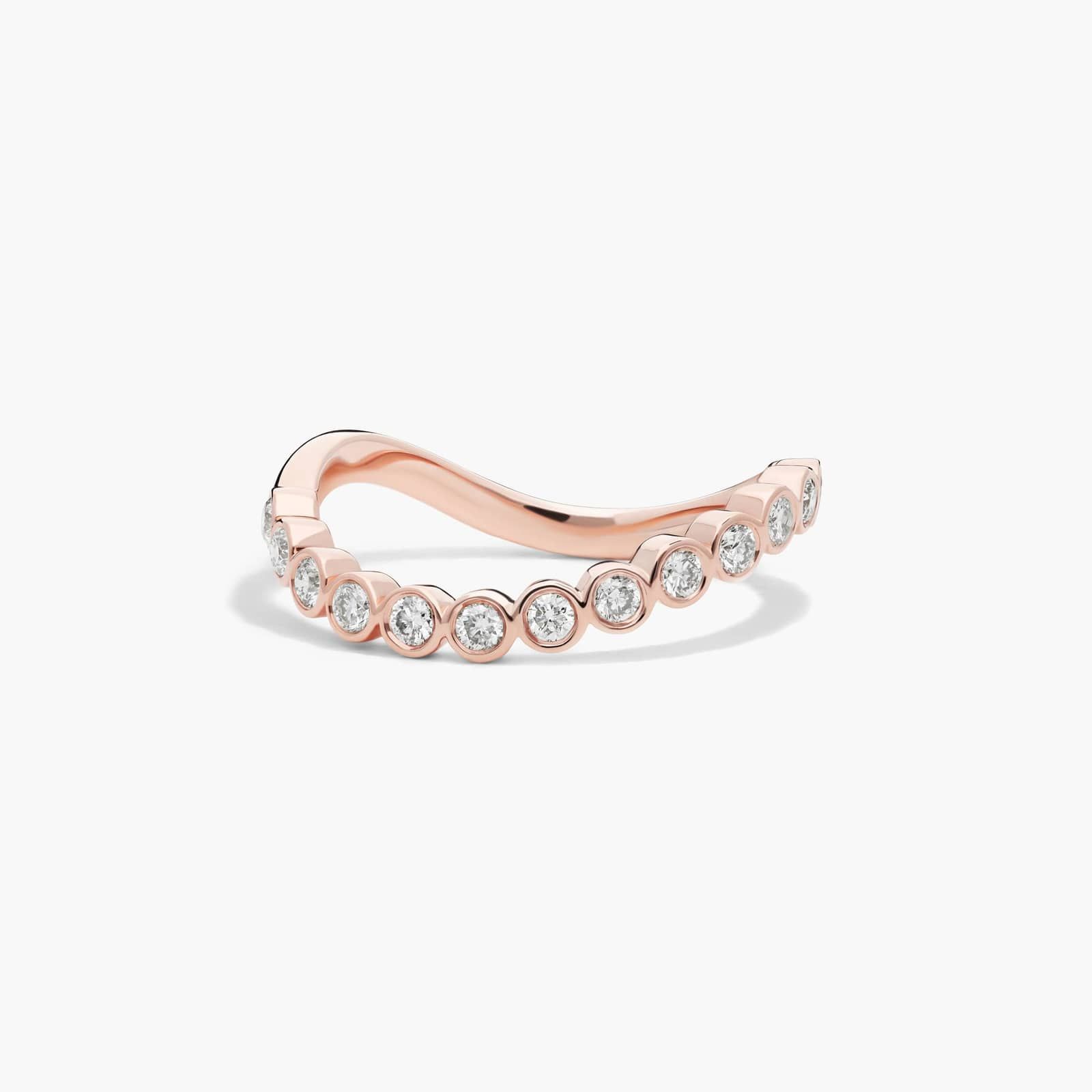 A contemporary design, this 14K Rose Gold wedding ring from the Sculptural Waves collection features Bezel set Round diamonds. The bezel setting offers a smooth and modern aesthetic, and the ring is 2.3mm wide.
