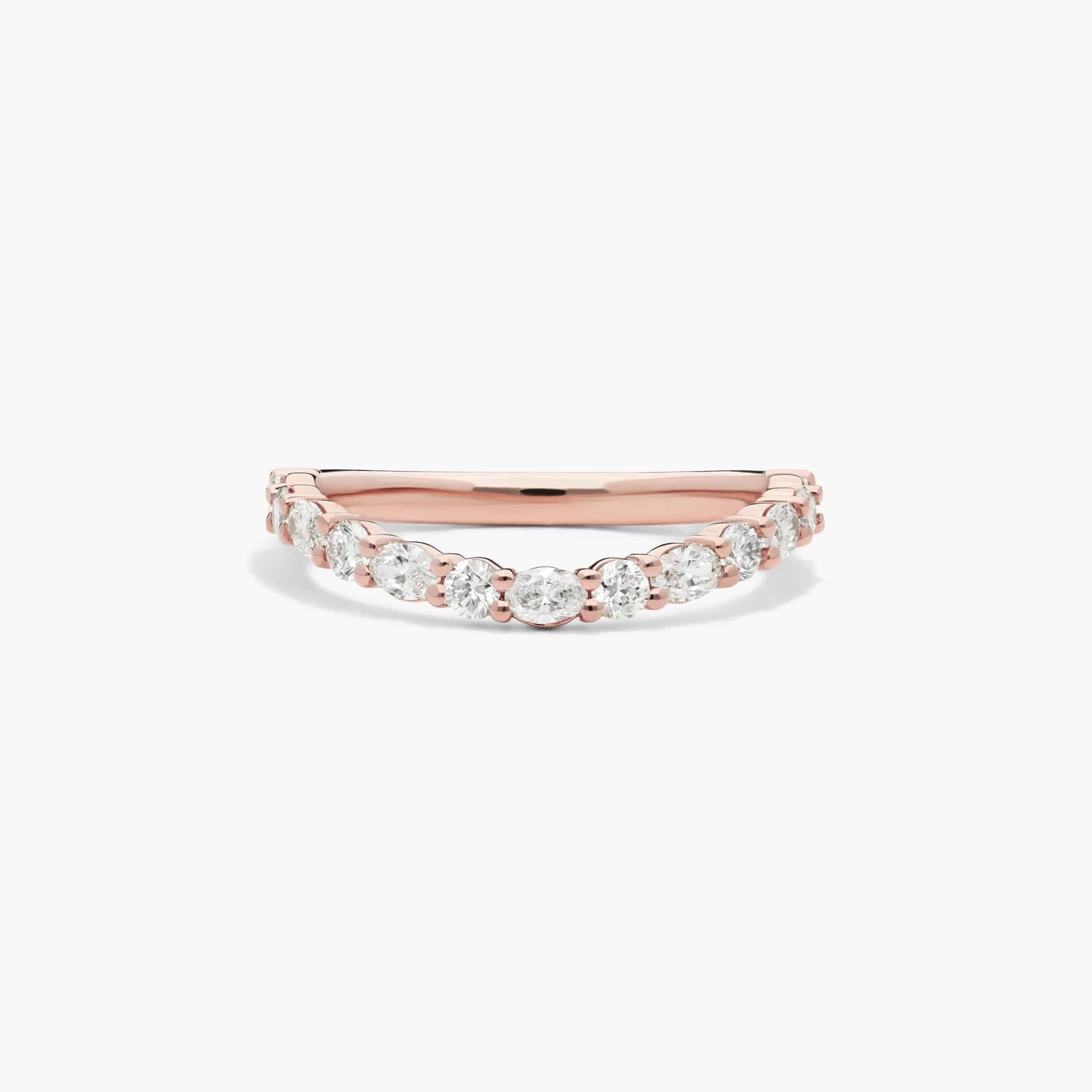 A truly unique design, this 14K Rose Gold wedding ring from the Sculptural Waves collection features Prong set Round & Oval diamonds. The elegant mix of shapes creates a distinctive and beautiful look, with a width of 2.3mm.