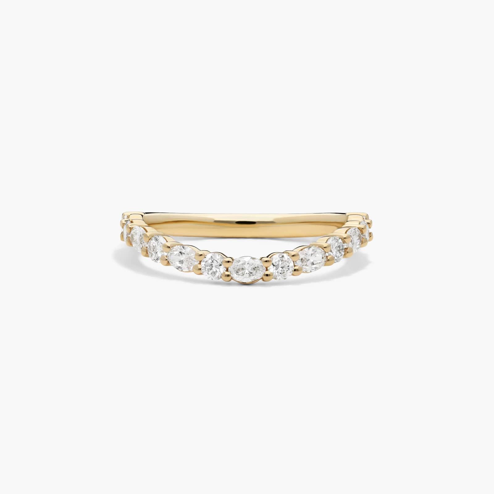 This elegant wedding ring in 18K Yellow Gold from the Sculptural Waves collection features Prong set Round & Oval diamonds. The warm metal highlights the beautiful combination of diamond shapes, with a width of 2.3mm.