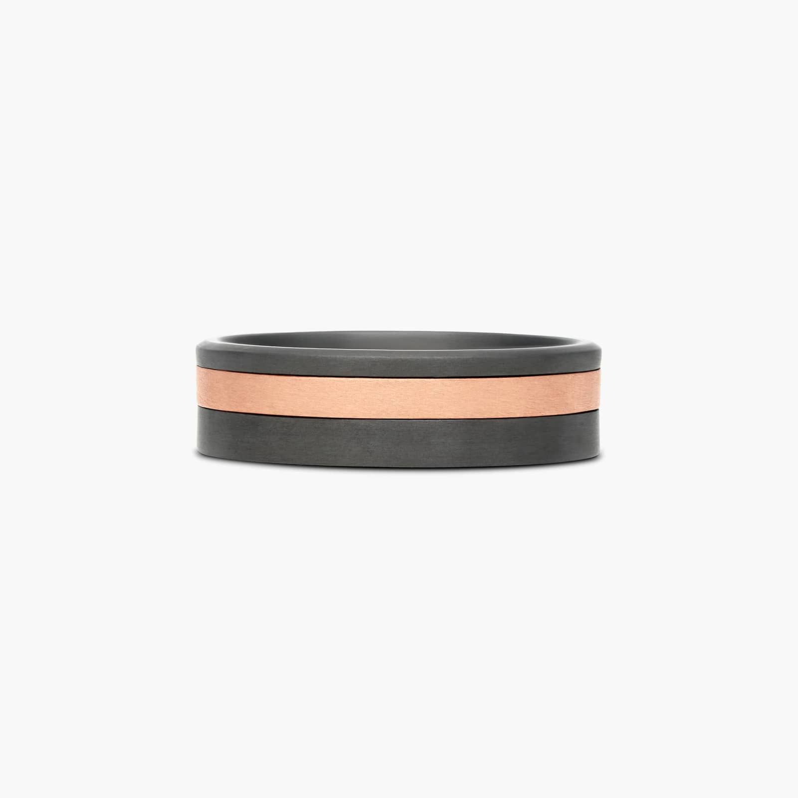 This contemporary 7mm blackened tantalum ring is embellished with a contrasting 14K rose gold satin finish to convey a modern and sleek look.