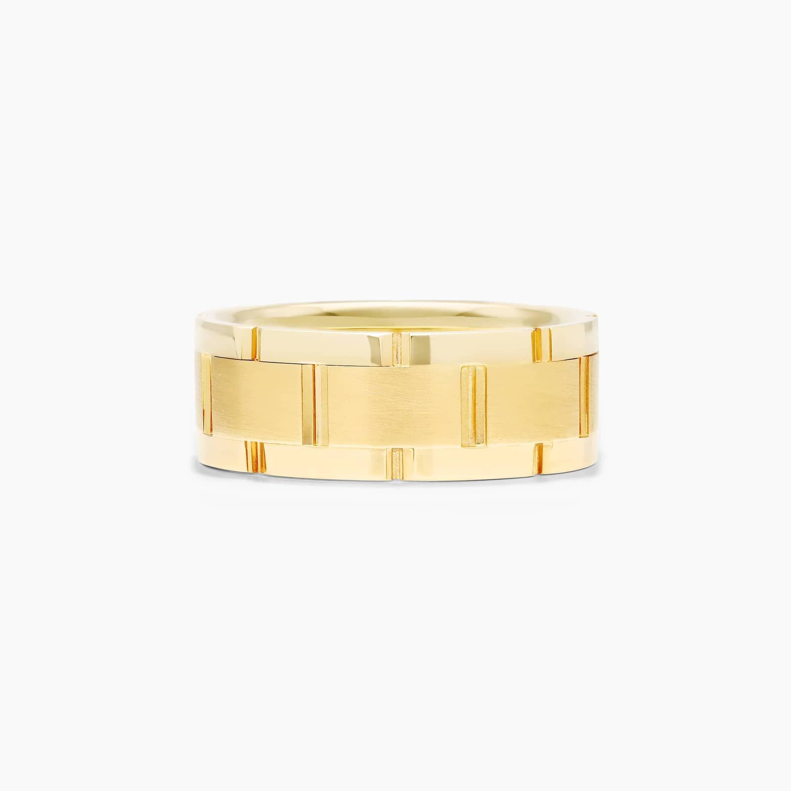 High polished grooves trace out an elegant brick pattern that resembles watch links. The high polished edges contrast the satin finished center and comfort fit design.