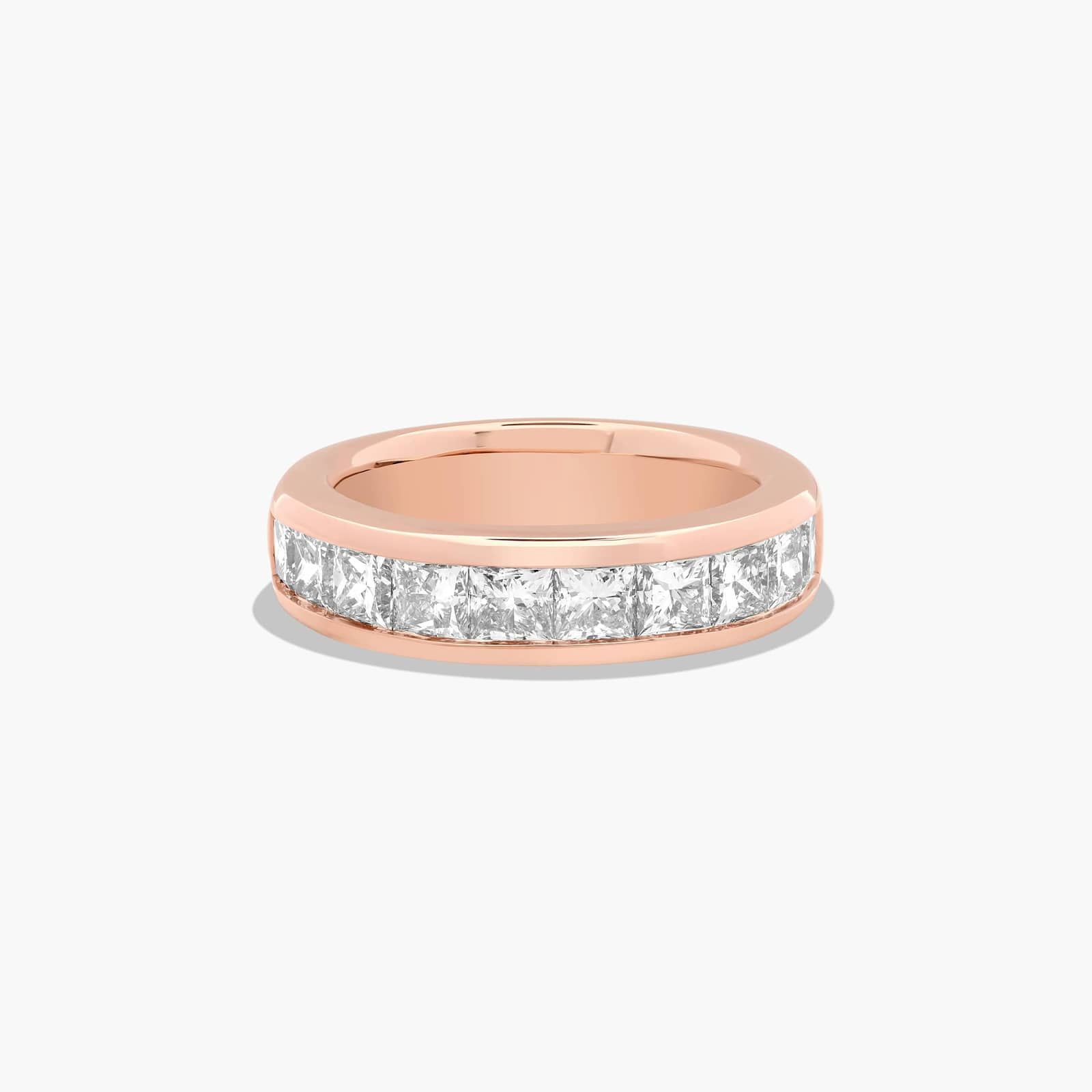 A classic design, this channel set ring shows off princess cut diamonds that are set low to the finger offering a very sleek feel.