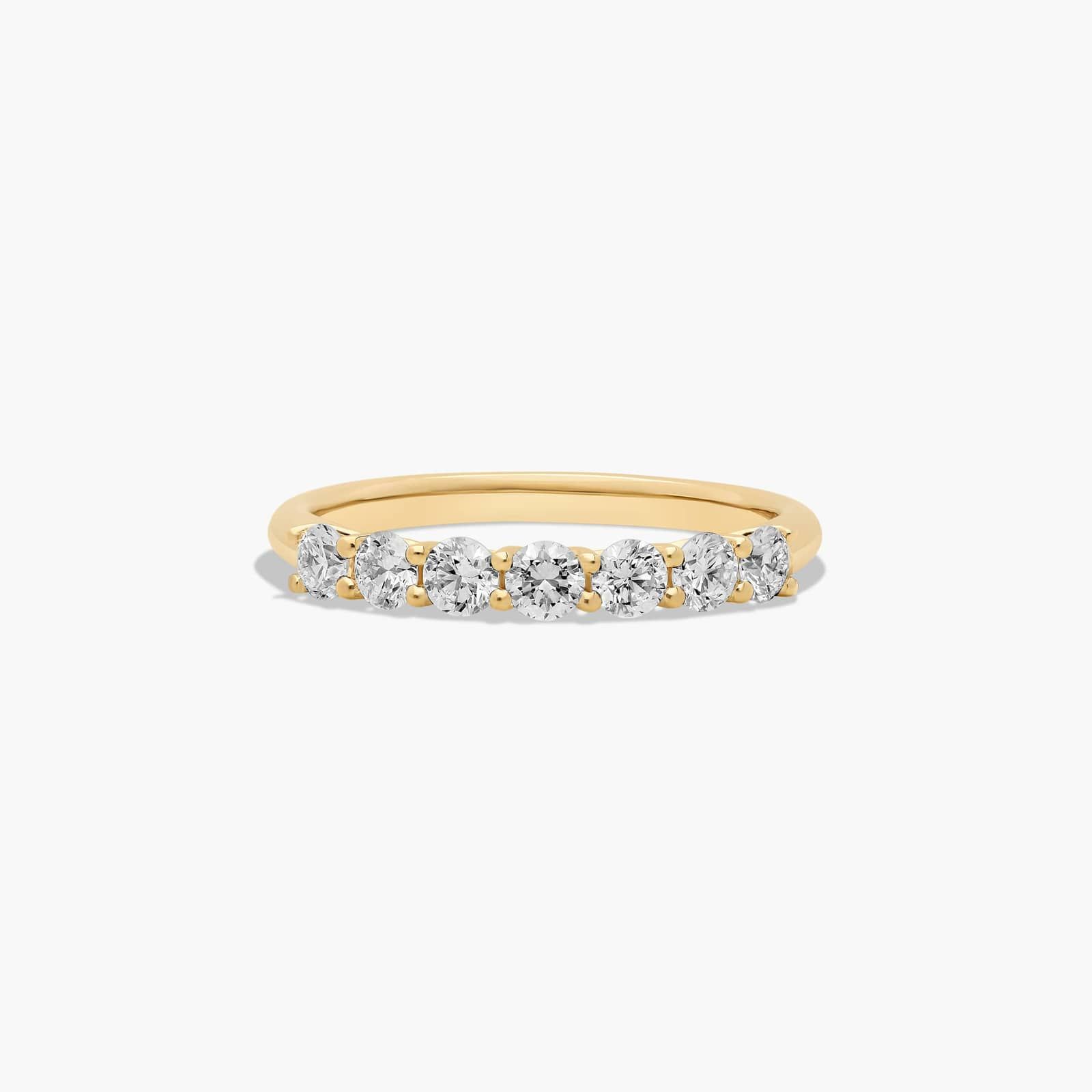 Slender prongs cross over one another to weave elegant trellis baskets. This finely crafted setting features a striking side profile that will only enhance the beauty of seven lab grown round brilliant diamonds.