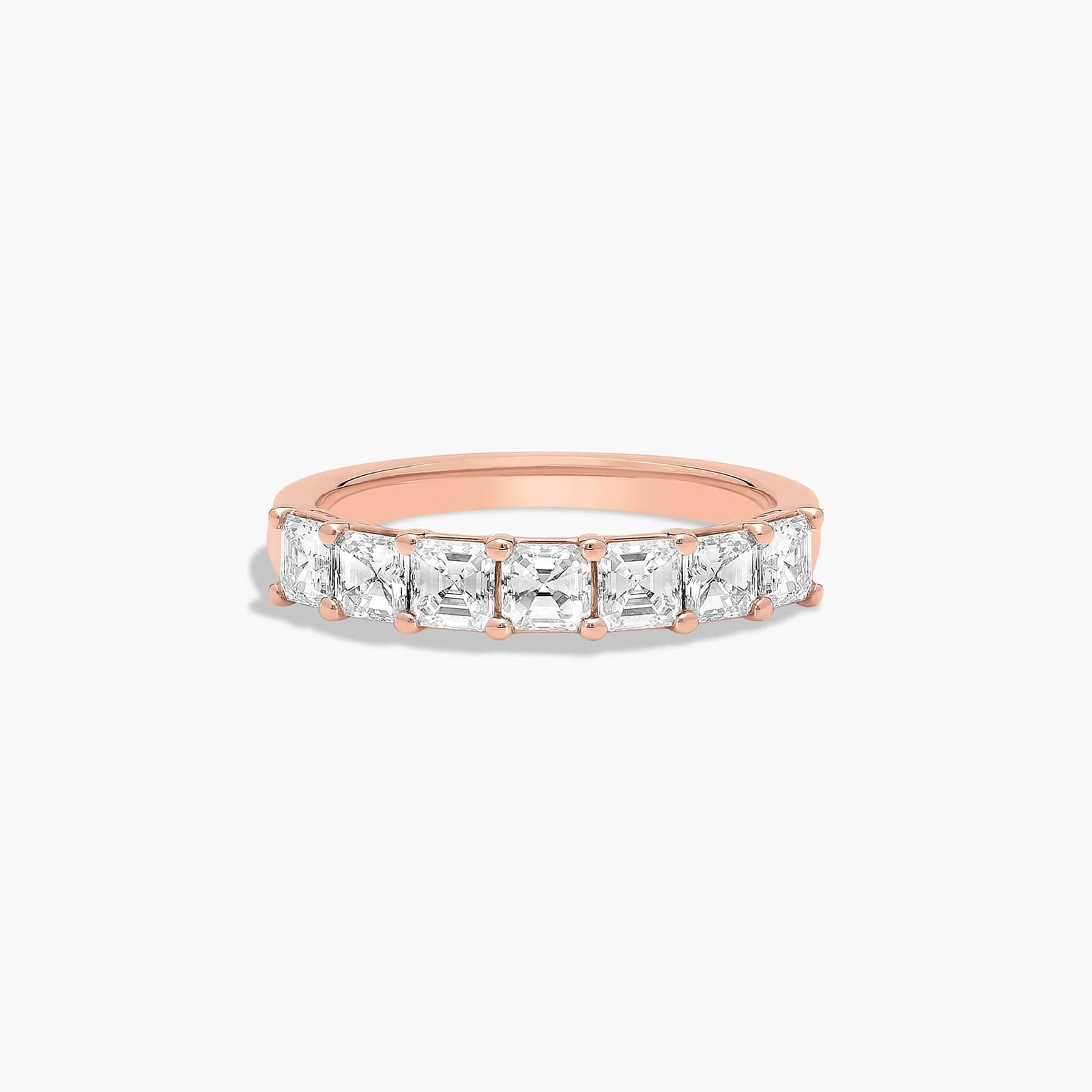 This timeless seven stone anniversary ring features the boldness and elegant gleam of asscher cut diamonds. A classic, tailored shared prongs setting allows the maximum amount of the diamonds surface to show.