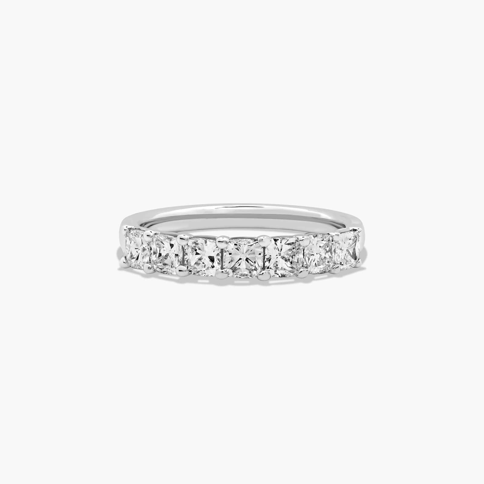 This timeless seven stone anniversary ring features the boldness and intense sparkle of cushion shape diamonds. A classic, tailored shared prongs setting allows the maximum amount of the diamonds surface to show.
