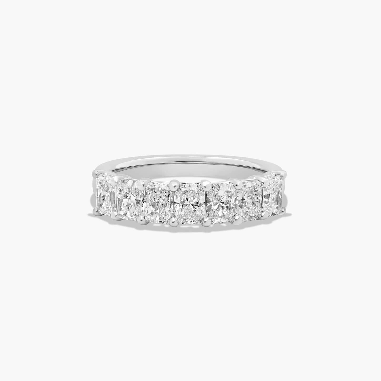 This timeless seven stone anniversary ring features the boldness and intense sparkle of radiant cut diamonds. A classic, tailored shared prongs setting allows the maximum amount of the diamonds surface to show.
