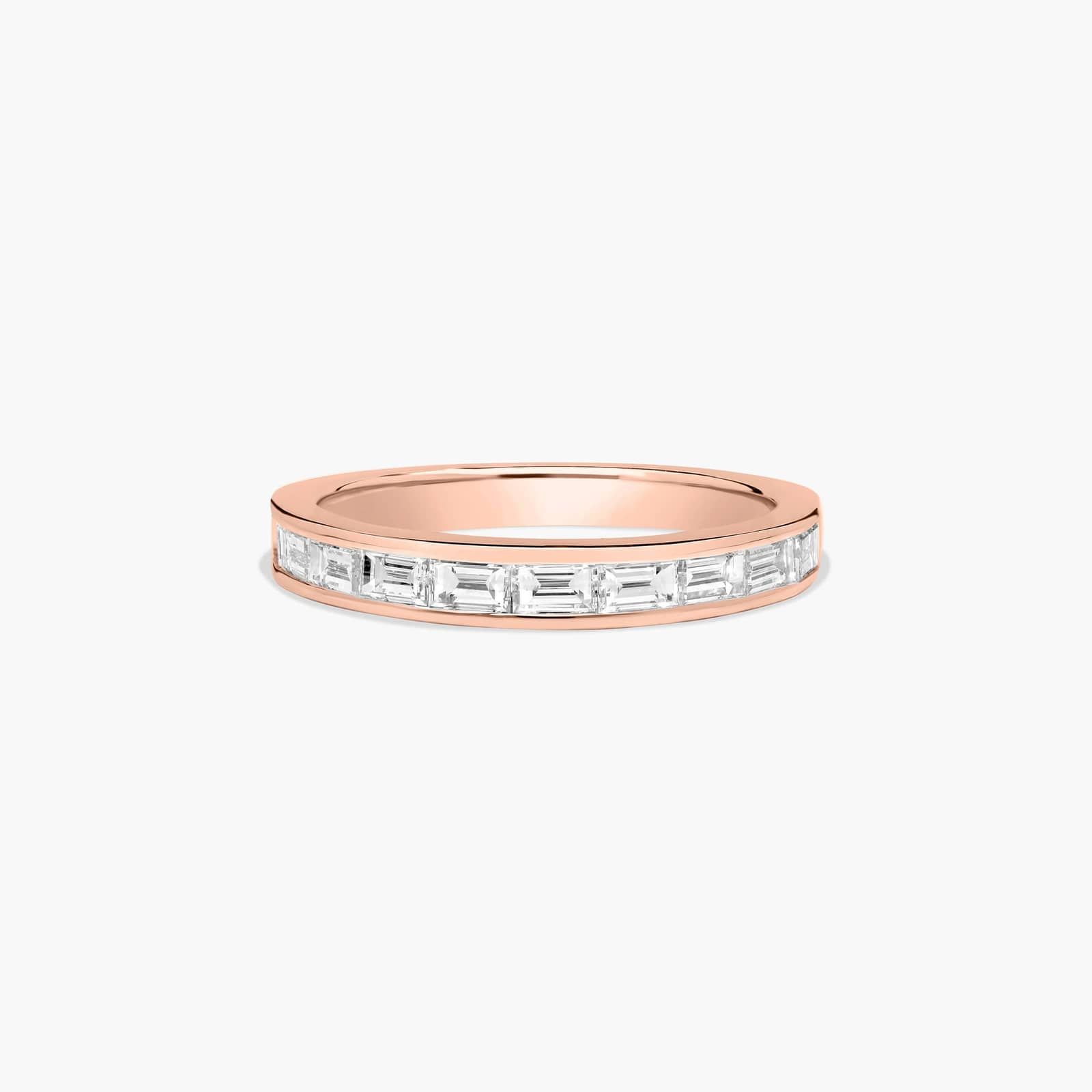 Baguette diamond wedding ring in a channel setting is a classic compliment to any engagement ring. This timeless band can be worn with the matching engagement rings as well as stacked with complimentary rings.