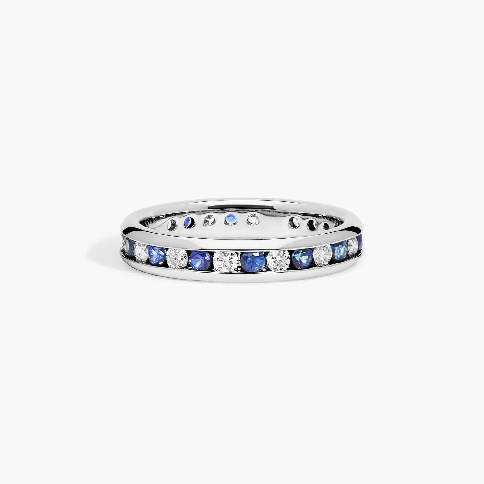 Beautiful blue sapphires add the perfect burst of color to a timeless classic. This ring features alternating round brilliant diamonds and blue sapphires channel set on a sleek band.