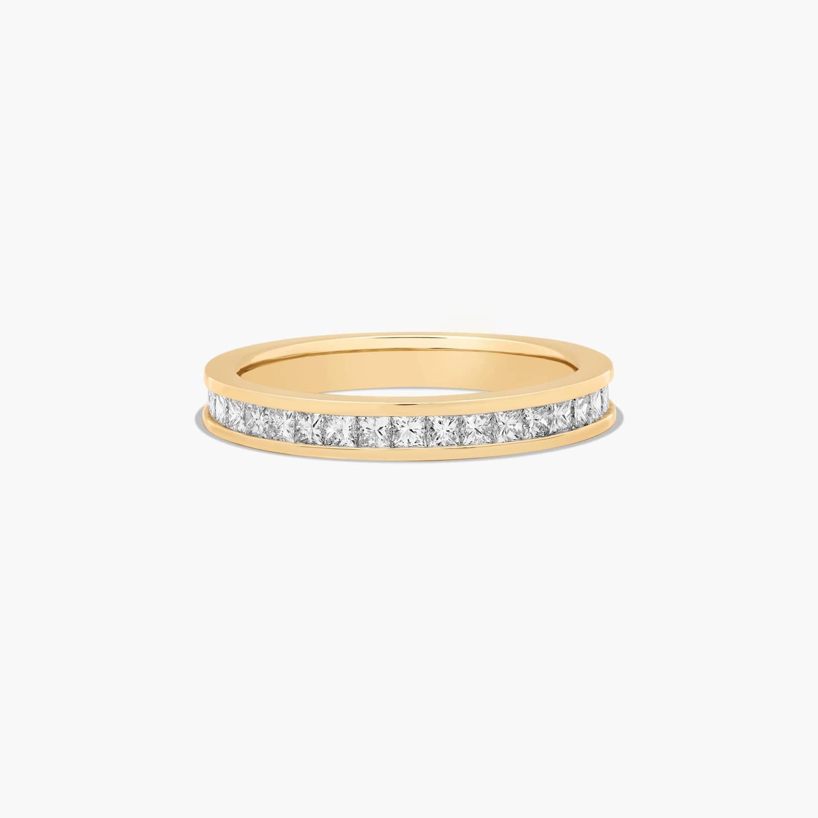 A row of 25 fiery, princess shaped channel-set diamonds gives this wedding ring a sleek, polished look.