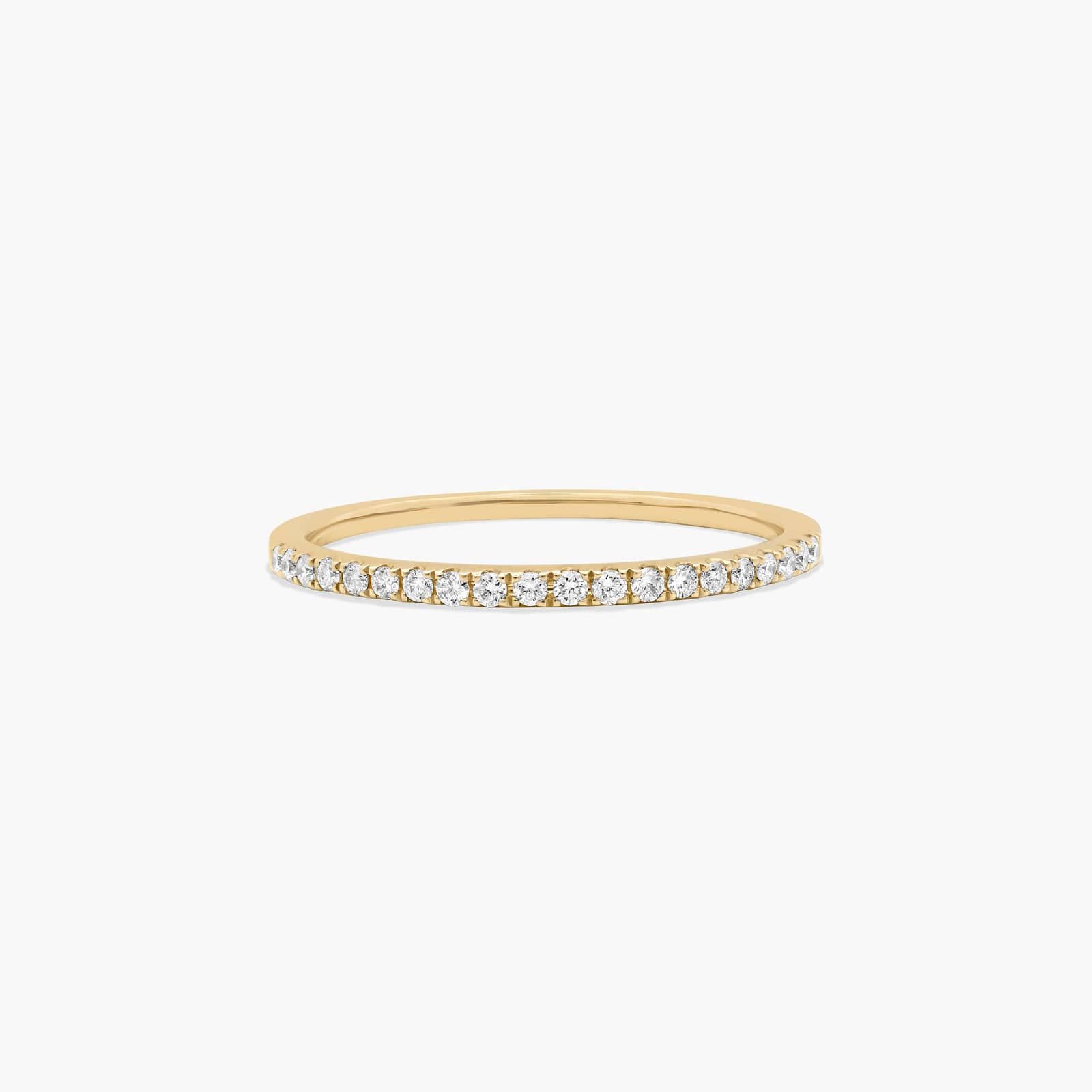 Delicate and sophisticated this single row diamond band is perfectly wearable alone or stacked with other rings for a glamorous and trendy look. Beautifully crafted with round brilliant cut diamonds set into a gold setting band.
