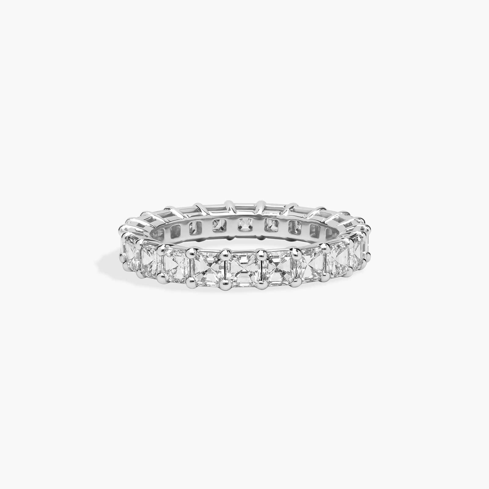 A dazzling circle of 3 ct. tw. Asscher-cut diamonds sets this stunning platinum eternity ring apart and makes it an ideal wedding ring or anniversary gift. *Number of diamonds and carat total weight will vary depending on ring size. Clear the Vault.