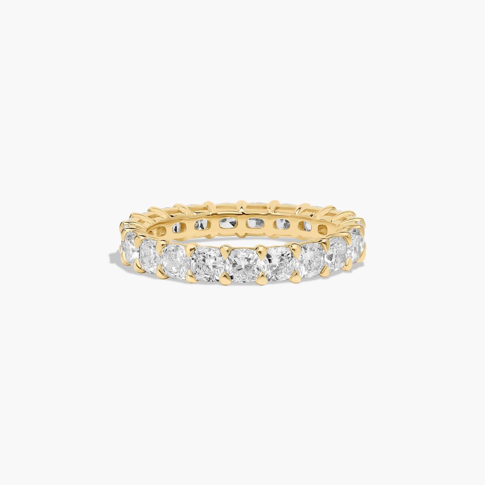 This timeless eternity ring features the boldness and intense sparkle of cushion cut diamonds. A classic, tailored shared prongs setting allows the maximum amount of the diamonds surface to show. *Number of diamonds and carat total weight will vary depending on ring size.